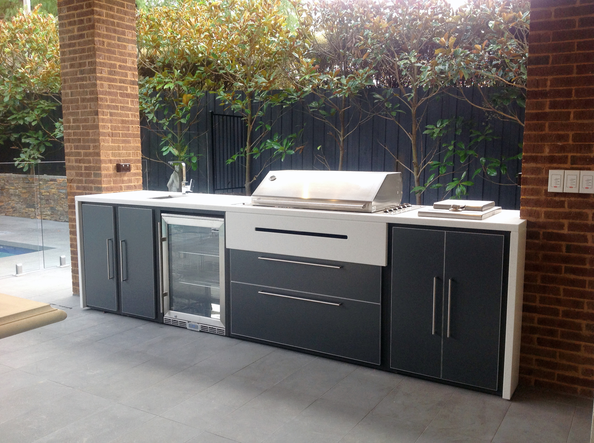 Our quality patented Australian designed and made steel outdoor kitchen frames require no more than a cordless screwdriver and some basic tools to assemble and install. They offer the flexibility to incorporate a range of kitchen storage options and cabinet finishes and bench tops to create a dream outdoor kitchen specific to your budget and home’s landscape.